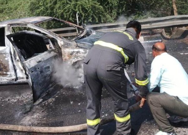 हाईवे पर चलती कार बनी आग का गोला, मची अफरा-तफरी