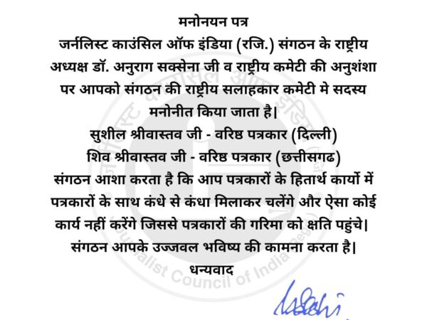 जर्नलिस्ट काउंसिल ऑफ इंडिया (रजि.) की राष्ट्रीय सलाहकार समिति में दो वरिष्ठ पत्रकार मनोनीत