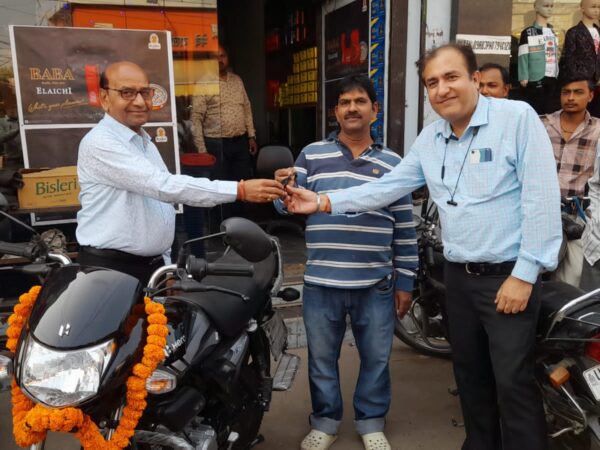 धर्मपाल प्रेमचन्द्र लिमिटेड द्बारा बाबा इलायची स्कीम के विजेता अर्जुन जायसवाल को सौंपी बाईक