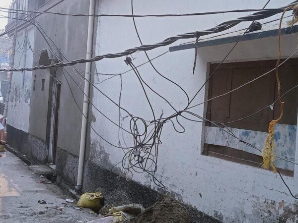 गलियारों मे झूलते बिजली के तार दे रहे हादसे को दावत