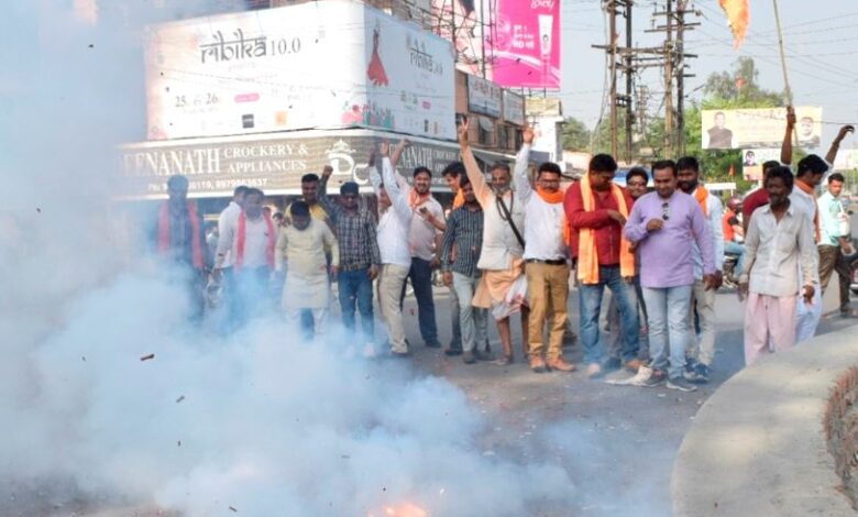 हिंदू युवा वाहिनी, सामाजिक संगठनों व रंग कर्मियों ने आतिशबाजी कर जताई खुशी, बाटी मिठाई