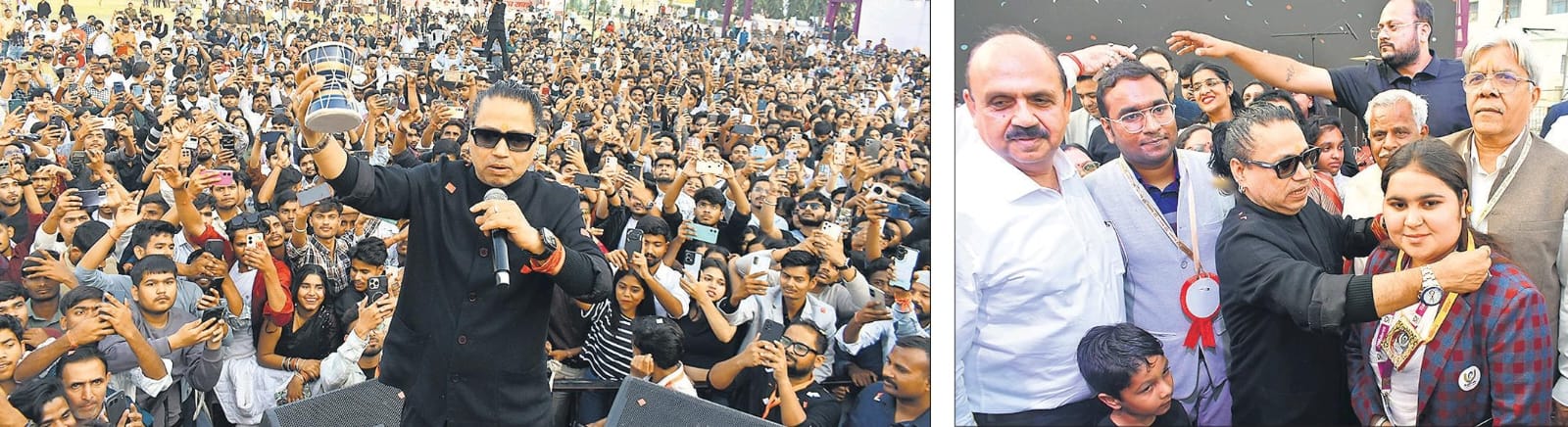 बरेली। राजश्री ग्रुप ऑफ इंस्टीट्यूशंस के तीन दिवसीय 17वें स्थापना दिवस आह्वान के दूसरे दिन गुरुवार को आयोजित स्टार नाइट में युवाओं का उत्साह चरम पर रहा। मशहूर पाश्वं गायक कैलाश खेर ने जैसे ही मंच से वगड़-वम पर अपनी प्रस्तुति दी तो लोग झूम उठे। खचाखच भरे परिसर मे ऊर्जा, आध्यात्मिकता और सांस्कृतिक उल्लास का अनूठा संगम देखने को मिला। देर रात तक छात्र-छात्राएं गीतों पर झूमते रहे। मुख्य अतिथि रूहेलखण्ड विश्वविद्यालय के कुलपति प्रो. केपी सिंह, संस्थान के चेयरमैन राजेन्द्र कुमार अग्रवाल, सचिव राकेश कुमार अग्रवाल, वाइस चेयर पर्सन डॉ. मोनिका अग्रवाल, प्रबंध निदेशक ई. रोहन बंसल, अभिनव स्वरूप, एकेडमिक एडवाइजर तूलिका अग्रवाल स्वरूप, उर्मिला आम्रवाल, सीओओ ऋषभ बंसल, इंशु अग्रवाल एवं पीयूष गुप्ता ने जल संरक्षण के संदेशार्थ जल भरो सेरेमनी से किया। कैलाश खेर के मंच पर आते ही तालियां बजने लगीं। कैलाश ने डमरू बजाकर शिव आहृवान करते हुए कहा, नाथ नगरी में आप लोग रहते हो। यहां चारों दिशाओं में शिव विराजमान है। शिव में लीन होकर भक्ति कर आनंदलो। समारोह में सिने जगत की मशहूर गायिका असीस कौर ने बंदेया रे बंदेवा, विजूरिया, रू-ब-रू, अदायें जैसे धमाकेदार गीत प्रस्तुत किये। समारोह में उपस्थित दर्शक, छात्र-छात्राएं एवं प्रतिभागी जूमकर झूमे। कुलपति प्रो. केपी सिंह एवं संस्थान के चेयरमैन राजेन्द्र कुमार अग्रवाल सहित प्रबन्ध समिति के सदस्यों ने मेधावियों को रजत पदक देकर सम्मानित किया। सर्वोच्च रैंक प्राप्त छात्रों में डीएलएड से ज्योति मिश्रा 94, आईटीआई से देव कुमार 90, बीटेक से राधेश्याम 84, बीएससी गृहविज्ञान से उमरा शकील 83, पॉलीटेक्निक से प्रियांशु सिंह 74, बीए एलएलबी से अभय प्रताप सिंह 74 और डीफार्म से मोहम्मद शोएब 73 प्रतिशत अंक पर छात्रवृत्ति आदि देकर सम्मानित किया।।