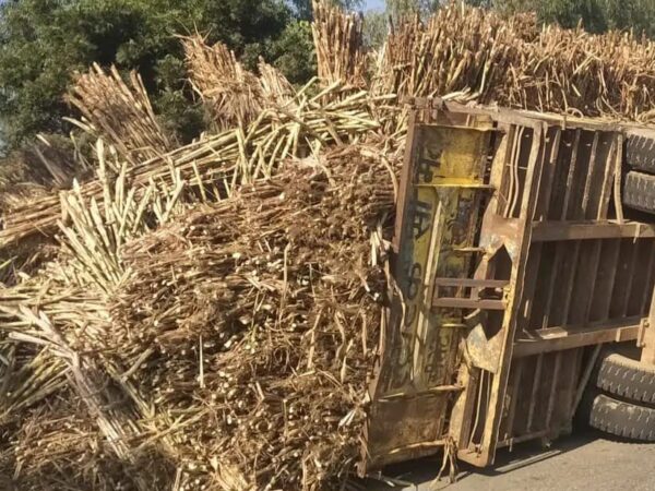 टायर पंक्चर होने पर गन्ना लदी ट्रैक्टर-ट्राली पलटी