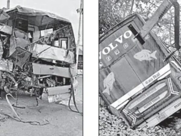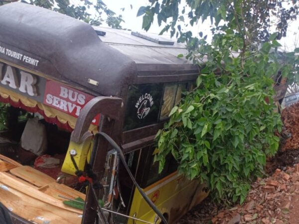 पिकअप बचाने के प्रयास मे बिजली के खंभे तोड़कर पलटी बस, चोटिल हुए यात्री