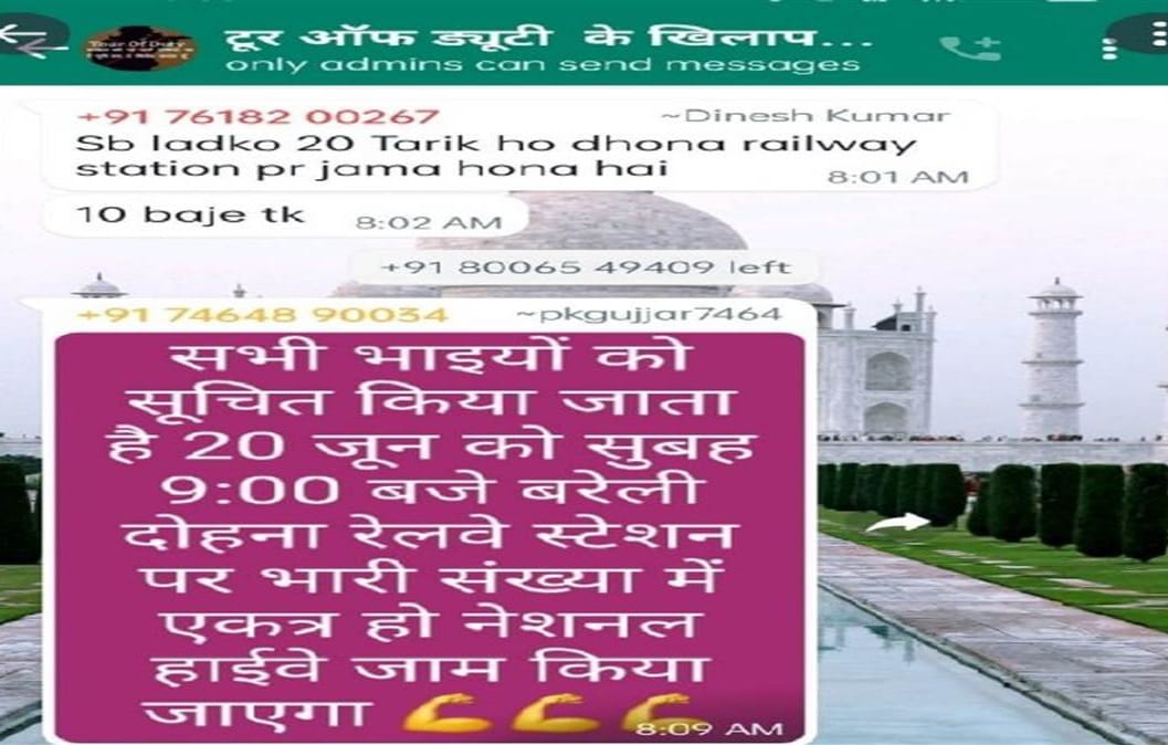 बरेली। केंद्र सरकार की अग्निपथ योजना का पूरे देश में विरोध हो रहा है। कई शहरों मे प्रदर्शन काफी हिंसक हो गया और ट्रेनों, बसों व थानों मे आग लगा दी गई। बरेली मंडल मे अभी तक हिंसक प्रदर्शन तो नही हुआ लेकिन एक बड़ी साजिश रची जा रही थी। जिले मे अग्निपथ योजना के विरोध मे 20 जून को दिल्ली व नैनीताल हाईवे जामकर उपद्रव की तैयारी की जा रही थी। जिसका व्हाट्सएप ग्रुप पर चल रही साजिश का चैट वायरल हो गया। जिससे पुलिस अलर्ट हो गई है। जिन चैट नंबरों के आधार पर पुलिस संबंधित लोगों की तलाश मे जुट गई है। वायरल हुए व्हाट्सएप चैट के अनुसार टूर ऑफ ड्यूटी के खिलाफ नाम से एक व्हाट्सएप ग्रुप बना हुआ है। ग्रुप मे सभी से अपील की गई है कि 20 जून को सभी दोहना रेलवे स्टेशन पर भारी संख्या में पहुंचे। यहां से दिल्ली व नैनीताल हाईवे जाम किया जाएगा। चैट मे इस बात का उल्लेख किया गया है कि बरेली जंक्शन मे पीएसी व पुलिस फोर्स होने के कारण आंदोलन जंक्शन पर नही करेंगे। सभी भाइयों को टोल टैक्स दोहना पर एकत्रित होकर नैनीताल हाईवे व दिल्ली हाईवे दोनों को जाम करना है। इसलिए अधिक से अधिक संख्या में आएं। चैट के स्क्रीनशाट लेकर एक युवक ने बरेली पुलिस, आइजी रेंज, एडीजी जोन को टैगकर ट्विटर पर शिकायत की है। पुलिस सक्रिय हो गई है। नंबरों के आधार पर लोगों की तलाश में जुट गई है।।