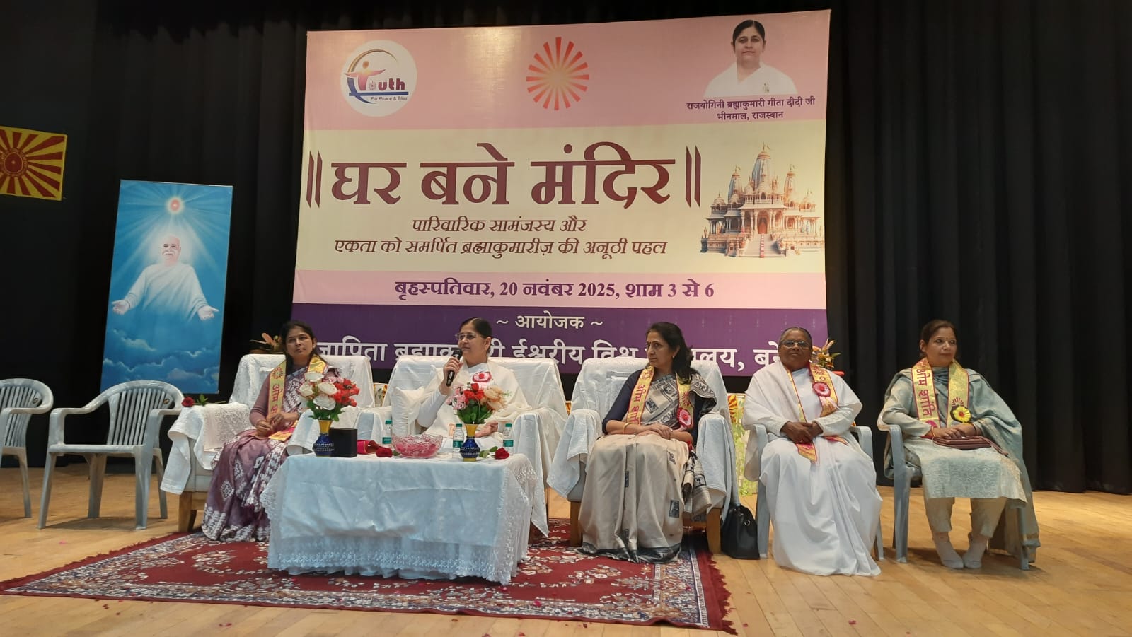 बरेली ।भीनमाल (राजस्थान) से पधारी गीता दीदी ने ब्रह्माकुमारी संस्था द्वारा आयोजित कार्यक्रम में जी.आई.सी. ऑडिटोरियम में मुख्य वक्ता के रूप में संबोधित करते हुए कहा कि घर को मंदिर बनाने के लिए परिवार में प्रेम, अपनत्व, तालमेल और संवाद कायम करना अत्यंत आवश्यक है। उन्होंने बताया कि पहले घरों में सभी सदस्य एक-दूसरे के सुख-दुख में सहभागी होते थे, लेकिन आजकल जीवनशैली और सोच में बदलाव के कारण घरों में रिश्तों में दरार, अविश्वास और दूरी बढ़ गई है। युवा वर्ग जीवन से थक चुका है, नशे के शिकार हो रहे हैं और परिवार बिखर रहे हैं।गीता दीदी ने कहा कि वह घर मंदिर बन सकता है जहाँ शुद्ध वातावरण, संवाद, सहयोग, प्रेम और पवित्रता हो। उन्होंने उपस्थित लोगों को सलाह दी कि अपनों के साथ समय बिताएं, संवाद बनाए रखें और रिश्तों के लिए थोड़ा वक्त जरूर निकालें। उनके अनुसार घर की दिव्यता और शुद्ध विचार ही उसे सचमुच का आश्रम या मंदिर बनाते हैं।इस अवसर पर नीतू कन्नौजिया (जिला सूचना अधिकारी), डॉ अंजू ऊपल (डायरेक्टर, ब्लड सेंटर), सोनल जी (प्रेसिडेंट, इनर व्हील ग्लोरी स्पार्क), अर्चना सक्सेना (शिक्षक, बरेली कॉलेज), वीनू सिंहा (अध्यक्ष, मानव सेवा क्लब), तथा प्रिंसिपल आर्य पुत्री कन्या इंटर कॉलेज समेत कई विशिष्ट अतिथि उपस्थित रहे। कार्यक्रम का शुभारंभ अतिथियों द्वारा दीप प्रज्ज्वलन कर किया गया।प्रातः कालीन सत्र में, व्यापारियों एवं उद्योगपतियों के सम्मेलन में गीता दीदी ने कहा कि व्यापार में प्रतिस्पर्धा और चुनौतियों का सामना करने के लिए पॉजिटिव कम्युनिकेशन, शांत स्वभाव और मधुर व्यवहार जरूरी है। उन्होंने बताया कि आत्मविश्वास, अनुशासन, सकारात्मक सोच, आत्मनियंत्रण जैसी आन्तरिक शक्तियां प्रत्येक व्यक्ति को हर परिस्थिति में सक्षम बनाती हैं। इस सत्र में अनुराग सक्सेना (अध्यक्ष, होटल वेलफेयर एसोसिएशन), अशोक गोयल (अशोका फोम), राजेंद्र घिल्डियाल, हरीश मलिक समेत 150 व्यापारी उपस्थित रहे। दीप प्रज्ज्वलन के साथ इस सम्मेलन की शुरुआत हुई।कार्यक्रम के दौरान, नीता दीदी ने सभी अतिथियों का स्वागत एवं परिचय कराया, पारुल दीदी ने गीता दीदी का विस्तृत जीवन परिचय प्रस्तुत किया जबकि संचालन की जिम्मेदारी रजनी दीदी ने निभाई। मोहित भाई द्वारा प्रस्तुत गीत ने माहौल को अध्यात्मिक रंग से सराबोर कर दिया।