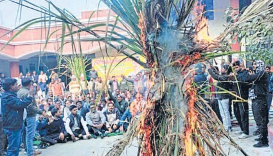 नवाबगंज, बरेली। बकाया गन्ना मूल्य भुगतान की मांग को लेकर तहसील में चल रहा किसानों का धरना सोमवार को भी जारी रहा। इस दौरान किसानों ने गन्ने की होली जलाकर प्रदर्शन किया। ओसवाल चीनी मिल ने पिछले दो वर्ष से किसानों का बकाया भुगतान नहीं किया। चीनी मिल पर किसानों का 70 करोड़ रुपये बकाया है। जिसे देखते हुए शासन ने चीनी मिल की आरसी जारी कर दी है लेकिन प्रशासन अब तक वसूली नही कर सका है। बकाया भुगतान की मांग को लेकर पिछले एक सप्ताह से किसान पैनी नजर सामाजिक संस्था की अध्यक्ष सुनीता गंगवार के नेतृत्व मे धरना दे रहे हैं। सोमवार म को भी किसानों का धरना जारी रहा। सोमवार को किसानों ने तहसील परिसर में गन्ने की होली जलाकर प्रदर्शन किया। यहां क्षेत्र पंचायत सदस्य अर्जुन गंगवार, कुमुद गंगवार, ब्रहमानंद गंगवार, पूर्व ब्लॉक प्रमुख तेज प्रकाश गंगवार, पप्पू गंगवार, प्रवीन उर्फ टीटू, ब्रजेश गंगवार, वाहिद, संतोष कुर्मी आदि थे।।