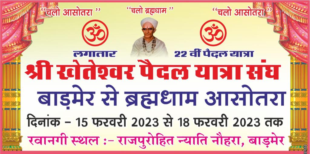 बाड़मेर/राजस्थान- श्री खेतेश्वर पैदल यात्रा संघ बुधवार को बह्मा धाम आसोतरा के लिए रवाना होगा पैदल संघ श्री राजपुरोहित छात्रावास से साधु संतों की सानिध्य से अतिथियों द्वारा हरी झंडी दिखाकर रवाना करेंगे ।