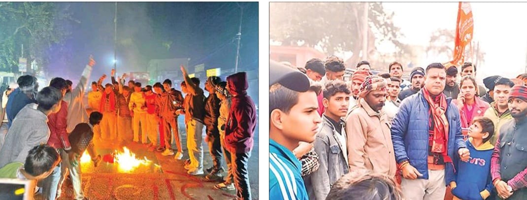 बरेली देहात। बांग्लादेश मे हिंदू युवक की हत्या के विरोध मे जिले मे कई स्थानों पर विभिन्न संगठनों ने पुतला दहन कर प्रदर्शन किया। केंद्र सरकार से हिंदुओं की सुरक्षा और बांग्लादेश पर दबाव डालने के लिए ठोस कूटनीतिक कदम उठाने की मांग की। सिरौली मे अंतर्राष्ट्रीय हिंदू परिषद एवं राष्ट्रीय बजरंग दल के हिंदू हेल्पलाइन जिलाध्यक्ष नितिन पांडे के नेतृत्व में कस्बे में बांग्लादेश के खिलाफ प्रदर्शन किया गया। कार्यकर्ताओं ने बांग्लादेश के प्रधानमंत्री का पुतला दहन कर रोष व्यक्त किया। नितिन पांडे ने कहा कि बांग्लादेश में हिंदुओं और दलित समाज पर हो रहे अत्याचार मानवता को शर्मसार करने वाले हैं। उन्होंने भारत सरकार से मांग करते हुए कहा कि बांग्लादेश में अल्पसंख्यक हिंदुओं की सुरक्षा को लेकर कूटनीतिक स्तर पर ठोस कदम उठाए जाएं। पीड़ित परिवारों को न्याय दिलाने के लिए अंतर्राष्ट्रीय मंचों पर आवाज बुलंद की जाए। दोषियों पर कठोर कार्रवाई सुनिश्चित करनी चाहिए। पदाधिकारियों ने प्रशासन से मांग करते हुए कहा कि स्थानीय स्तर पर भी संदिग्ध गतिविधियां करने वालों पर नजर रखी जाए। रिठौरा मे विश्व हिंदू महासंघ के पदाधिकारियों ने बांग्लादेश के खिलाफ विरोध प्रदर्शन किया। सड़क पर प्रतीकात्मक रूप से बांग्लादेश का फ्लैग बनाकर उस पर आग लाई। इस दौरान जमकर नारेबाजी। प्रदर्शनकारियों ने कहा कि हिंदुओं पर हो रहे अत्याचारों को रोका जाए। जल्द दोषियों पर कठोर कार्रवाई हो और बांग्लादेश मे अल्पसंख्यक हिंदुओं की सुरक्षा के लिए कड़े कदम उठाए जाएं। महंत तुलसीदास महाराज, मनोज कश्यप, संजीव कश्यप, शुभम गुप्ता, हरपाल कश्यप, विनोद कश्यप, सर्वेश, सूरज, विकास सक्सेना पोशाकी लाल साहू आदि मौजूद रहे।।
