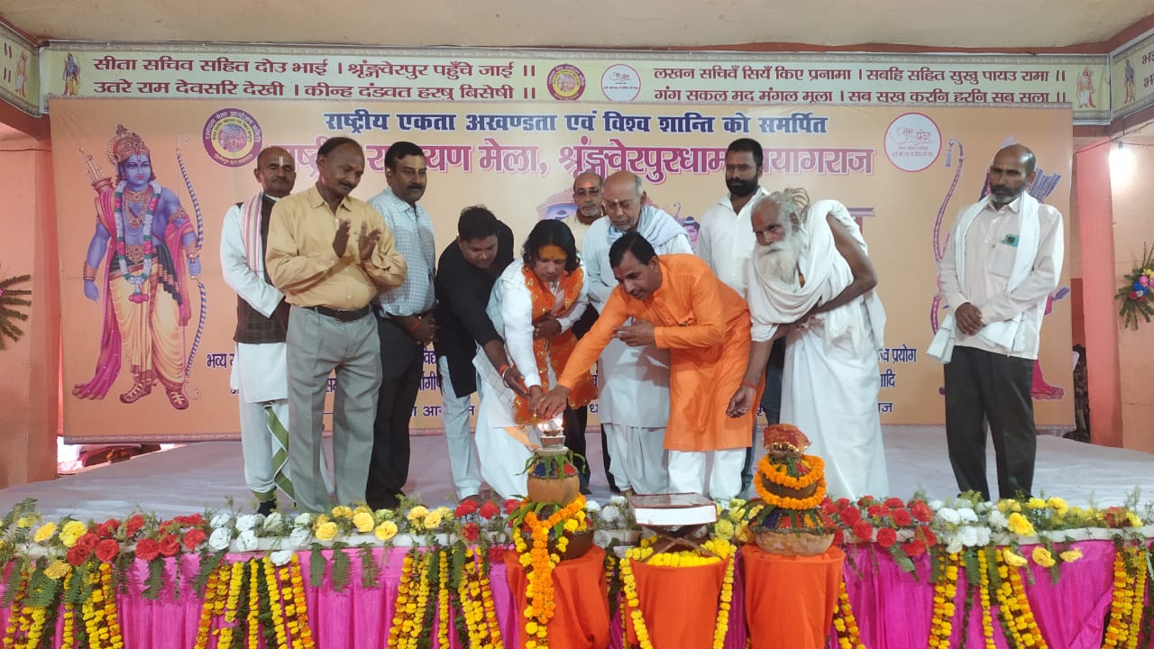 श्रृंगवेरपुर।रामायण मेला आयोजन समिति द्वारा किए जा रहे हैं रामायण मेला के मंचन में आज दूसरे दिन स्वामी अतुल जी महाराज ने दीप प्रज्वलन कर विद्यालयों एवं महाविद्यालयों के द्वारा रामायण ज्ञान प्रतियोगिता शैक्षिक सम्मेलन एवं सांस्कृतिक कार्यक्रम कर भगवान श्रीराम की कलाकृतियों पर सभी मैं अपने विचार रखे वही रामायण मेला आयोजन समिति के महामंत्री उमेश चंद्र द्विवेदी ने आए हुए सभी अध्यापक एवं छात्रों के प्रति आभार प्रकट करते हुए कहा कि जिस प्रकार से आज सभी छात्रों में भगवान के चरित्र का किरदार निभाते हुए किरदार के माध्यम से भगवान प्रभु श्री राम की कलाओं को प्रस्तुत किया इसी प्रकार सभी को प्रभु श्रीराम के चरित्र को स्वयं में अवतरित करना चाहिए और सभी प्रधानाचार्य को अंग वस्त्र रामायण पुस्तिका प्रशस्ति पत्र देकर सम्मानित किया गया इस बीच रामायण मेला के उपाध्यक्ष सियाराम सरोज जी अवध नारायण मिश्रा जी कार्यक्रम संयोजक राजमणि शास्त्री जी भारत चंद्र मिश्रा कार्यक्रम के संयोजक राजमणि शास्त्री भारत चंद्र मिश्रा सुभाष चंद्र यादव अमर सिंह विजय प्रकाश शेष नारायण द्विवेदी संयुक्त मंत्री अमित द्विवेदी कार्यक्रम का संचालन अनिल मिश्र ने किया तत्पश्चात राघव चरणानुरागी हरी ओम तिवारी जी ने श्री राम कथा का रसपान कराते हुए श्री राम कथा पर प्रकाश डाला।