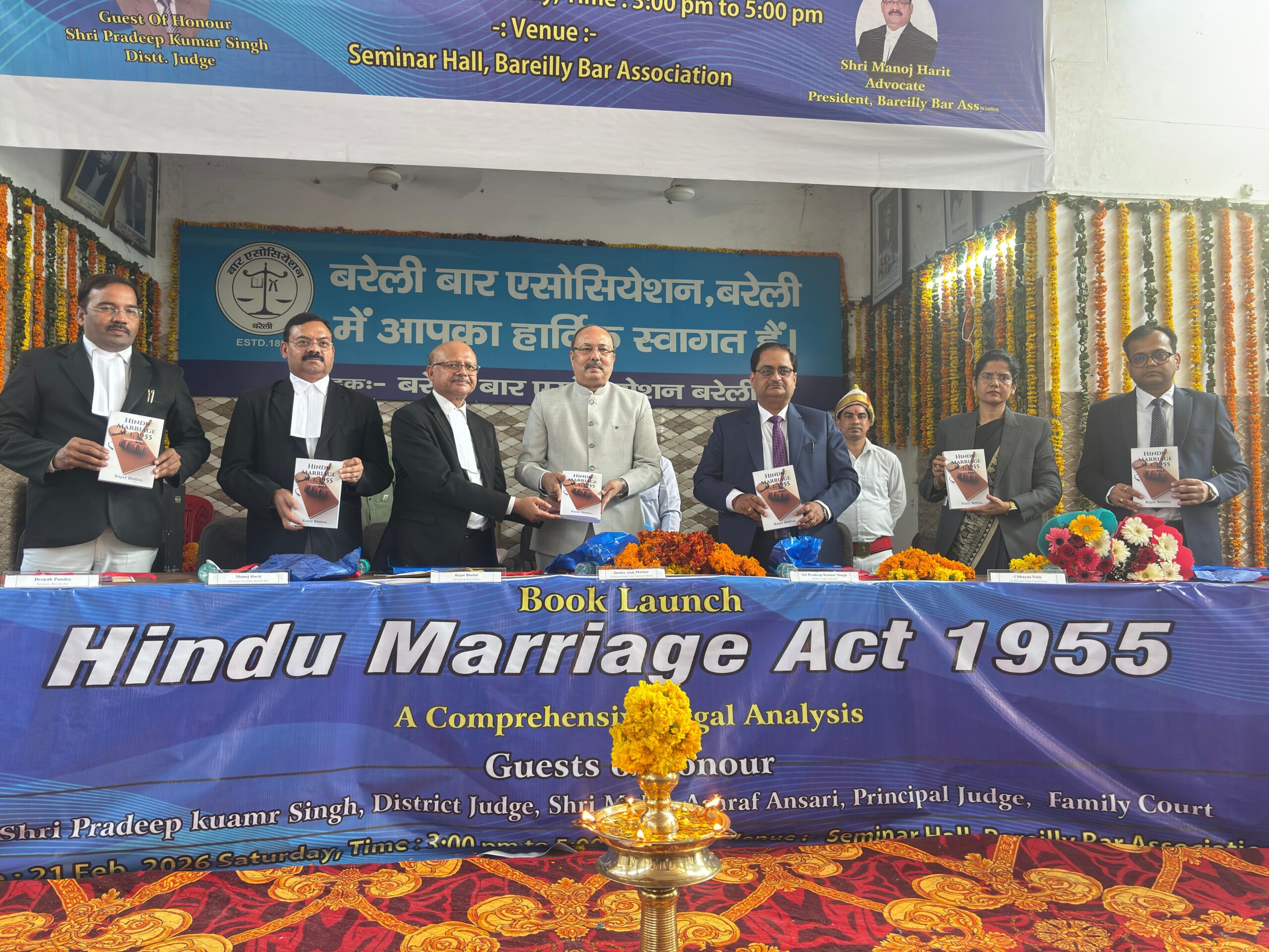 बरेली। बरेली बार एसोसिएशन के सभागार में वरिष्ठ अधिवक्ता श्री राजत बिंदल द्वारा लिखित “हिन्दू विवाह अधिनियम, 1955 — एक व्यापक टीका” ग्रंथ का लोकार्पण न्यायमूर्ति श्री आलोक माथुर (इलाहाबाद उच्च न्यायालय) के कर-कमलों से सम्पन्न हुआ। कार्यक्रम में न्यायिक अधिकारी एवं अधिवक्तागण बड़ी संख्या में उपस्थित रहे।