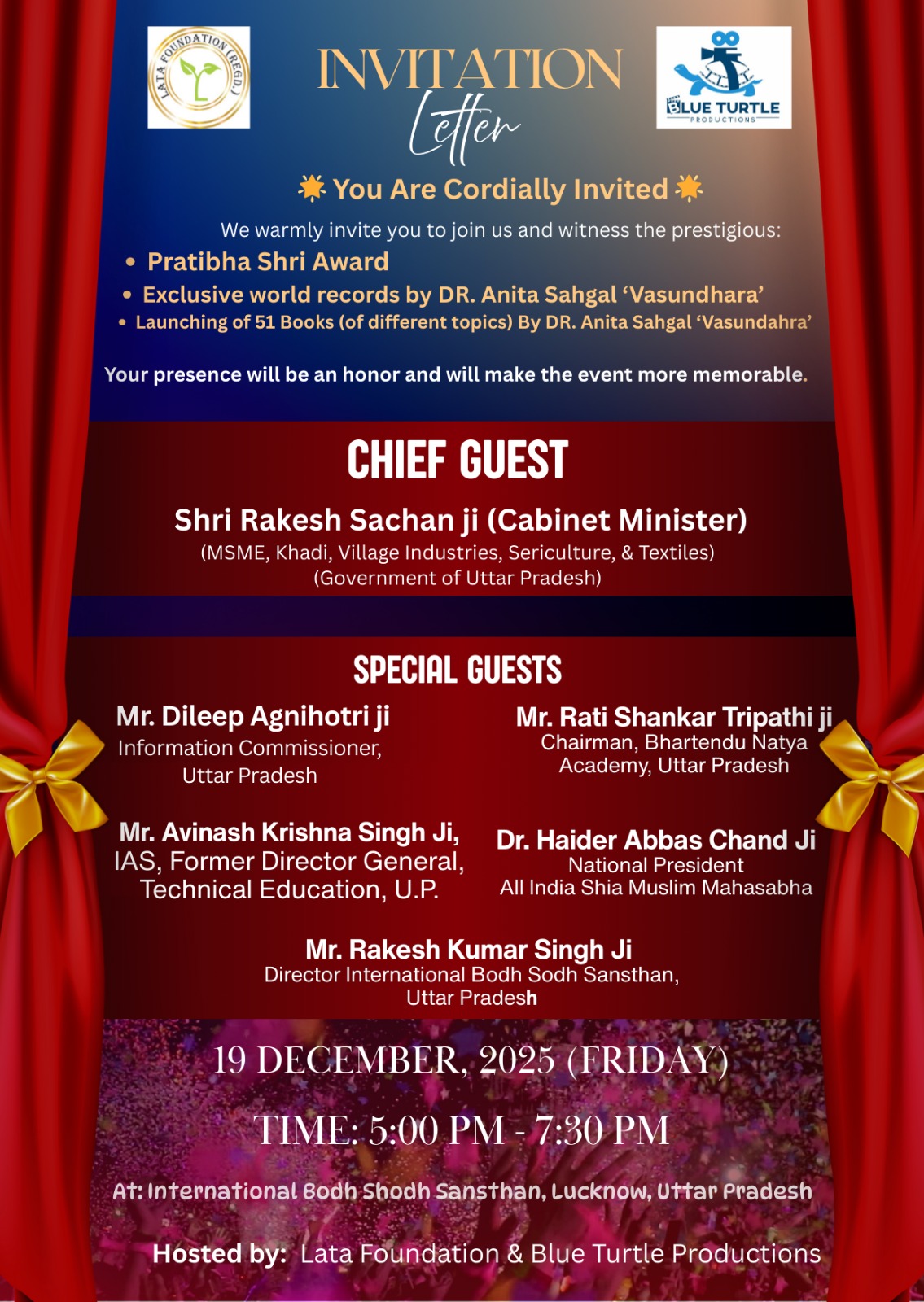 लखनऊ – अंतरराष्ट्रीय बोध शोध संस्थान, लखनऊ (उत्तर प्रदेश) में सायं 5:00 बजे से 7:30 बजे तक एक भव्य, गरिमामय एवं बौद्धिक कार्यक्रम का आयोजन किया जा रहा है। इस कार्यक्रम का आयोजन लता फाउंडेशन एवं ब्लू टर्टल प्रोडक्शंस के संयुक्त तत्वावधान में किया जा रहा है, जिसमें देश-विदेश की कई प्रतिष्ठित हस्तियां एवं गणमान्य अतिथि शामिल होंगे।