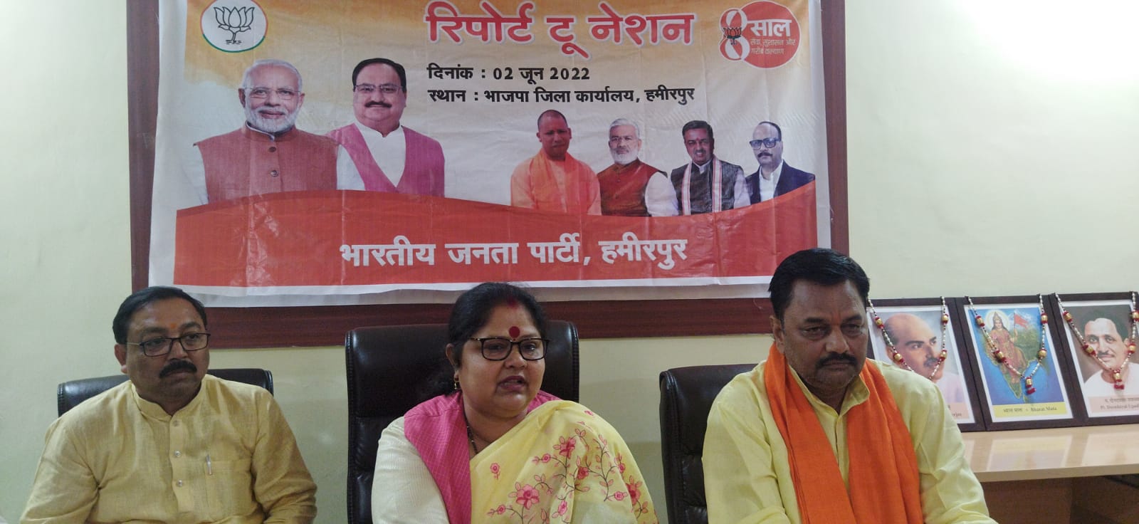 हमीरपुर – भाजपा के स्थानीय कार्यालय में केंद्र की भाजपा सरकार के 8 वर्ष पूर्ण होने पर प्रेस वार्ता का आयोजन किया गया | जिसमें केंद्र सरकार की 8 वर्ष की उपलब्धियां भाजपा की जिला प्रभारी रंजना उपाध्याय द्वारा गिनाई गई | जिला प्रभारी ने कहा कि प्रधानमंत्री जनधन खाते जब खोले जा रहे थे तब कोई नहीं जानता था कि इन खातों से जनता का कितना बड़ा काम होगा| जनधन खातों में केंद्र सरकार की योजनाओं का सीधे लाभ जनता तक पहुंचाया गया | कोरोना काल में जब देश के लाखों व्यक्तियों के सामने आर्थिक संकट खड़ा हुआ | तब देश के प्रधानमंत्री ने गरीबों एवं मजदूरों के जनधन खाते में धनराशि भेजकर आर्थिक सहयोग व गरीबों को निशुल्क राशन वितरण कर देश के प्रधानमंत्री द्वारा 80 करोड़ लोगों को प्रधानमंत्री गरीब कल्याण योजना के तहत मुफ्त खाद्यान्न दिया गया | उन्होंने कहा कि इतना ही नहीं प्रधानमंत्री द्वारा स्वच्छ भारत मिशन के तहत घर-घर शौचालय बनवाए गए | जिससे देश की महिलाओं को खुले में शौच जाने से निजात मिली| वहीं गंदगी से होने वाली तमाम बीमारियों से रोक लग गई | उन्होंने कहा कि भाजपा ने प्रधानमंत्री आवास योजना, प्रधानमंत्री उज्ज्वला योजना और अनेकानेक प्रधानमंत्री जन कल्याणकारी योजनाओं से गरीबों एवं मजदूरों को लाभान्वित किया गया | भाजपा जिला अध्यक्ष ब्रजकिशोर गुप्ता ने कहा कि जब देश में कोरोना महामारी जैसी घातक बीमारी से देश की जनता को बचाने के लिए देश के प्रधानमंत्री ने श्रद्धा और समर्पण भाव से सभी देशवासियों को मुफ्त में वैक्सीन का डबल डोज लगवाया गया | उन्होंने कहा कि प्रधानमंत्री आवास योजना के तहत गरीबों का घर पक्का बना कर छत के नीचे रहने का सौभाग्य प्रदान किया| देश के प्रधानमंत्री रात दिन गरीबों के लिए श्रद्धा और समर्पण भाव से कार्य करने के लिए कटिबद्ध हैं | उन्होंने कहा कि देश के प्रधानमंत्री ने देश ही नहीं विदेशों में ही भारत को सम्मान दिलाने का काम किया | आज हमारा भारतीय गौरवान्वित है | बुंदेलखंड में पेयजल की समस्या को देखते हुए केंद्र सरकार ने जल जीवन मिशन के तहत हर घर नल योजना शुरू की है | जिसका फायदा 6 करोड़ ग्रामीणों तक योजना का लाभ पहुंचेगा | जिला उपाध्यक्ष लक्ष्मी रतन साहू ने कहा कि गंगा नदी प्रत्येक भारतीय नागरिक के लिए आस्था का केंद्र है जिसके लिए देश के प्रधानमंत्री द्वारा नमामि गंगे योजना के तहत गंगा नदी की साफ सफाई कराई गई | उन्होंने कहा कि प्रधानमंत्री द्वारा जम्मू कश्मीर से धारा 370 हटाने का कार्य किया गया| और आतंकवादियों पर प्रभावी कार्रवाई की गई | जिससे आतंकी हमलों में भारी कमी आई है | उन्होंने कहा कि देश के प्रधानमंत्री के अथक प्रयासों से देश को उच्च शिखर तक पहुंचाने का कार्य देश के प्रधानमंत्री द्व