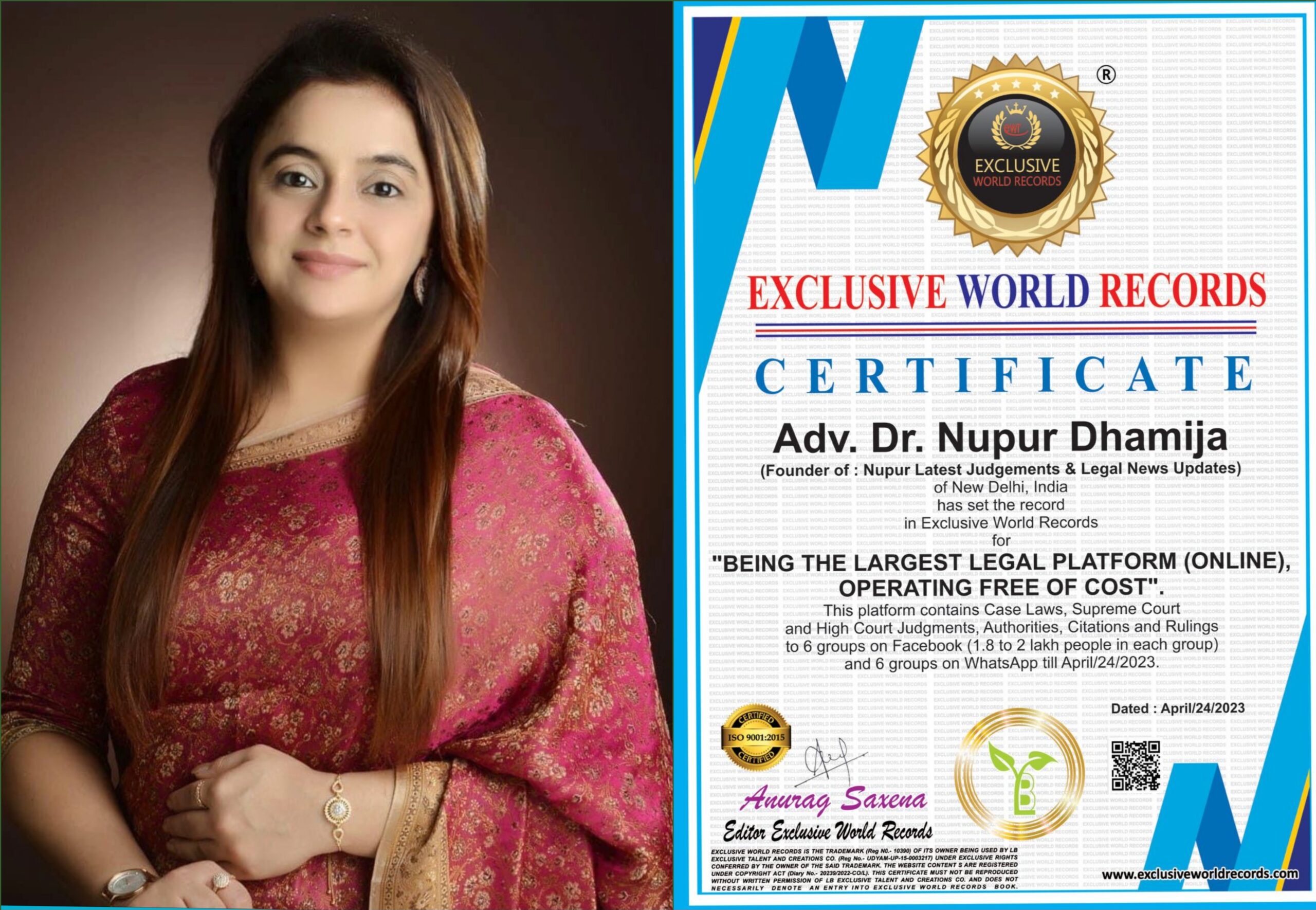 (Founder of : Nupur Latest Judgements & Legal News Updates) of New Delhi of India has set the world record Exclusive World Records and in King’s Book of World Records for “BEING THE LARGEST LEGAL PLATFORM OPERATING FREE OF COST”.